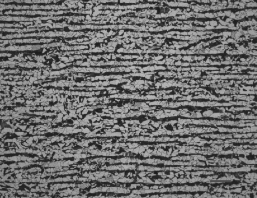 热变形后亚共析钢中的铁素体和珠光体呈带状分布,如同1所示,称为带状组织。其形成原因主要有两种可能:一种是在两相区温度范围内变形,铁素体沿奥氏体晶界析出后变形伸长,再结晶后奥氏体与铁素体变成等轴晶粒,但其分布仍呈条带状;另一种是热变形中枝晶偏析或夹杂物被拉长,当奥氏体冷却时,偏析区域(如富磷贫碳区域)首先析出铁素体且呈条带状分布,随后铁素体两测的奥氏体区再转变成珠光体,最终成条带状的铁素体加珠光体的混合物,带状组织也使材料产生各向异性,其影响与流线类似。