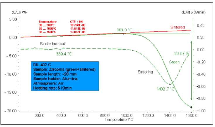 上图比较了氧化锆陶瓷的生坯与烧结成品的测试结果。其中绿色曲线为生坯的升 温测试结果,样品在约 389℃前后有粘合剂的烧失过程,体现为 dL/dt 一阶微分 曲线上的一些小峰;从约 970℃后生坯发生烧结收缩,收缩率 20.07%,dL/dt 峰 温 1402.7℃。红色曲线则为已烧结陶瓷成品的升温测试。